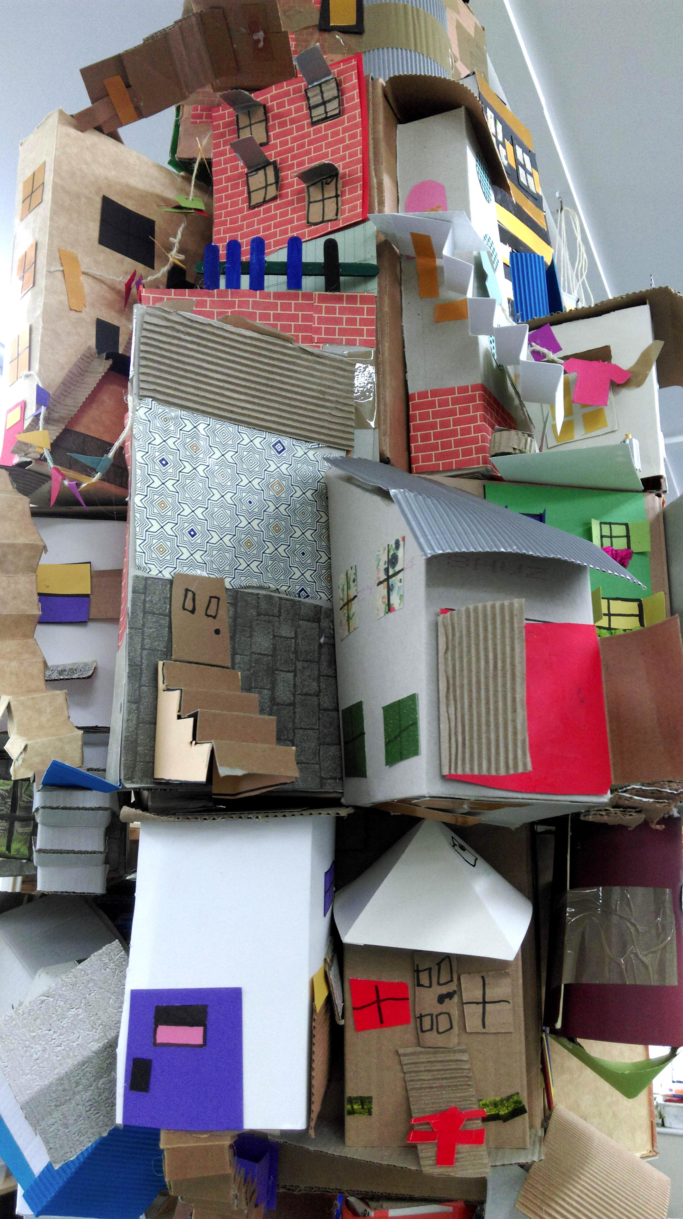 Aysgarth Boys School Arts week 2018. I devised this project from a personal passion to make a minature cardboard city. I have yet to make mine, but the 5 to 12 year olds who created these sculptures really made me proud. The hanging cities are made from cardboard boxes, corrugated card, cereal packets and patterned paper. Each child created their minature house (or two) of their own design, which were then assembled with my help and a glue gun. The results are these impressive, gravity defying fantasy cities. I was particularly impressed by the children’s attention to detail and imaginative structures. They really loved this one.