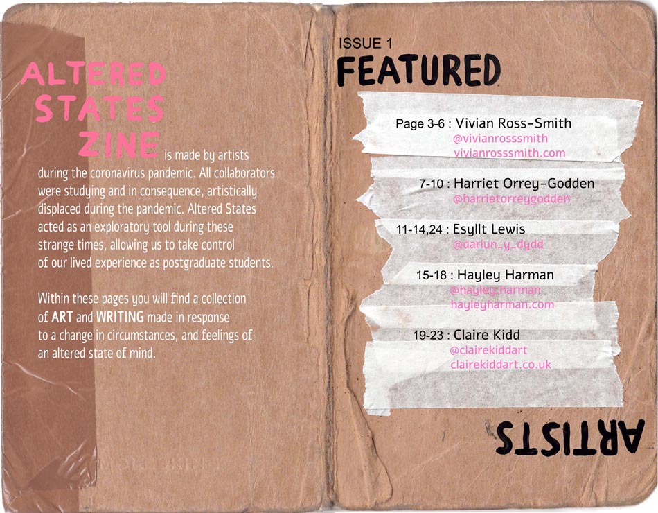 Altered States is a colaborative zine made by myself and four fellow artists making art in isolation during the coronavirus pandemic. We were all studying when the country went into lockdown in March 2020 and found ourselves working from home, away from our student community, studios and workshops. We made this zine as an exploratory tool during these strange times, allowing us to take control of our new found circumstances. The first issue of our Zine features a collection of art and writing made in response to our experiences during this time, and our feeling of an altered state of mind.